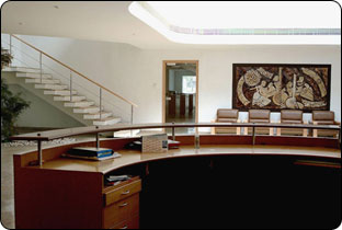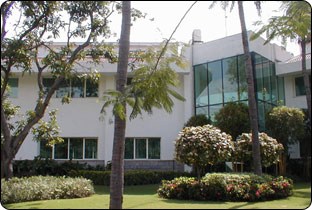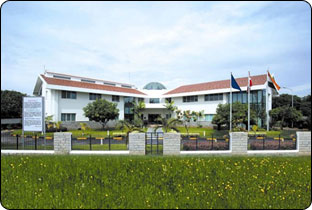 Shaped like a windmill- in ‘y’ form with 3 separate wings. Ambience of a resort. Front office & factory separate by landscape levels & extensive landscaping.